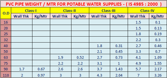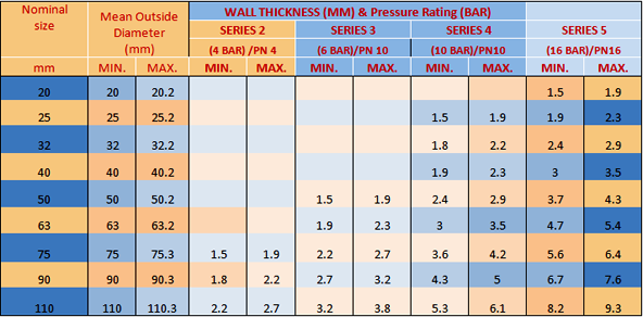 PVC Pressure pipes as manufactured as per IS 4985-2000 , DIN 8062 standards for irrigation sewage water and plumbing pipes with Sizes from 20 mm to 110 mm. We have independent lab facility with all testing instrument to test the pipe manufactured.